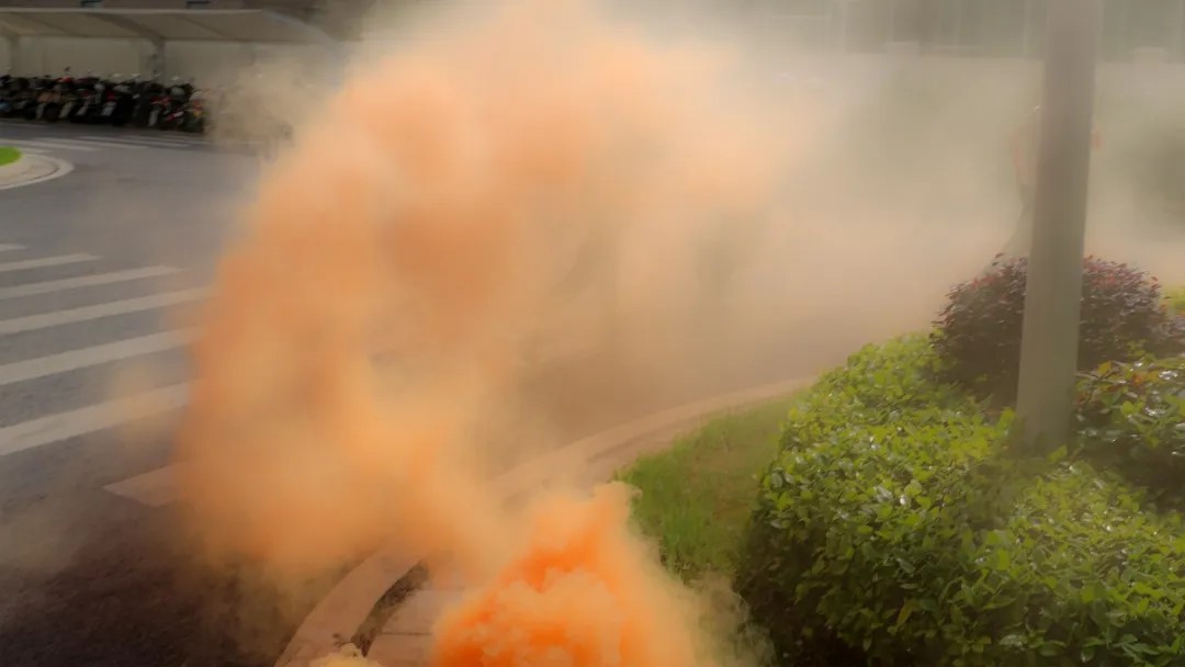 At 8:30 a.m., the drill was counting down. “All present, below, I announce that the drill has officially begun.” With the commander-in-chief explaining the requirements of the drill, the drill officially began. On the first floor of the plant, the east and west sides of the escape routes and the front desk were set off smoke bombs, smoke rolled in the hallway.